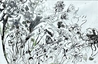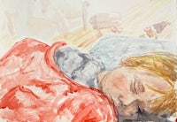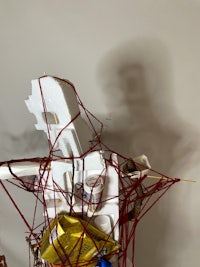 Embroidery thread, ink, natural pigment and watercolor on paper